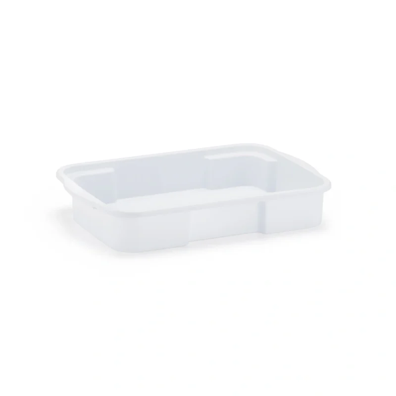 Fabricada em plástico resistente, a bandeja permite empilhamento seguro, otimizando espaço em cozinhas, escritórios, oficinas ou ambientes de armazenamento.
