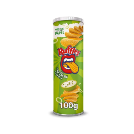 Batata Ruffles em tubo, sabor Sour Cream, crocante e prática para consumo a qualquer momento.