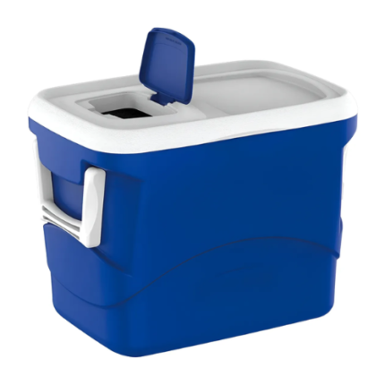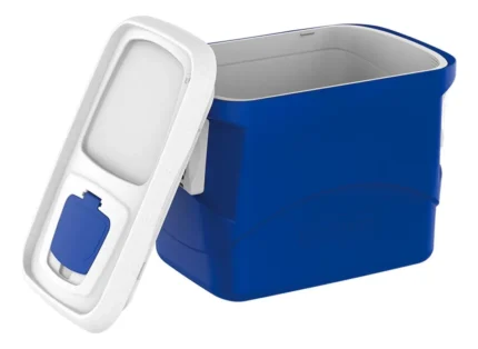 Caixa térmica 50 litros na cor azul, ideal para conservar bebidas e alimentos por longos períodos.