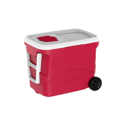Caixa térmica Soprano 50 litros com rodas, cor vermelha, prática, resistente e ideal para manter bebidas e alimentos gelados.