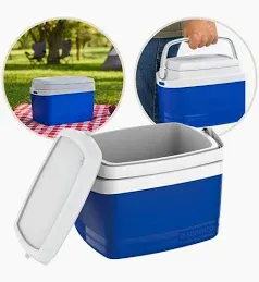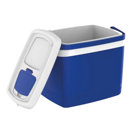 Caixa térmica azul com capacidade de 12 litros, ideal para conservar alimentos e bebidas em passeios, viagens e atividades ao ar livre.