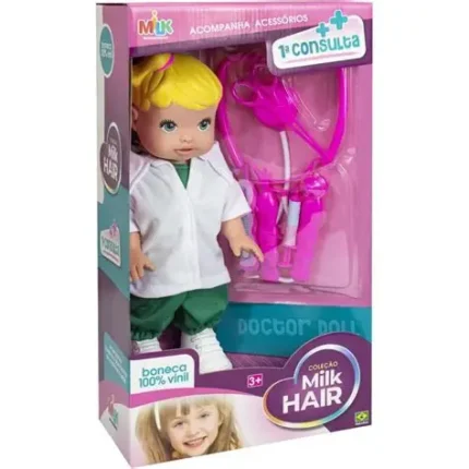 A Boneca Coleção Milk Hair 1ª Consulta da Milk Brinquedos oferece uma experiência de brincadeira educativa. Mede aproximadamente 31 cm de altura e acompanha acessórios médicos para estimular o papel de cuidador nas brincadeiras infantis. Produzida com materiais seguros e acabamento cuidadoso. Indicada para crianças acima de 3 anos.
