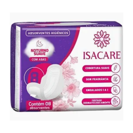 Absorvente Isacare Higiênico com abas, pacote com 8 unidades, ideal para uso diário com conforto e proteção.