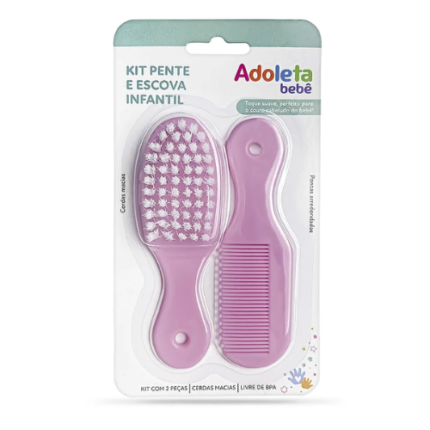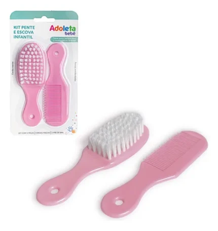 Kit infantil Adoleta com pente e escova rosa, desenvolvido para cuidar dos cabelos do bebê com suavidade e segurança.