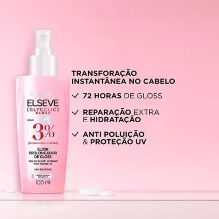 Serum capilar Elseve Elixir Glycolic Gloss 100ml para brilho intenso, maciez e proteção contra frizz.