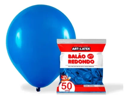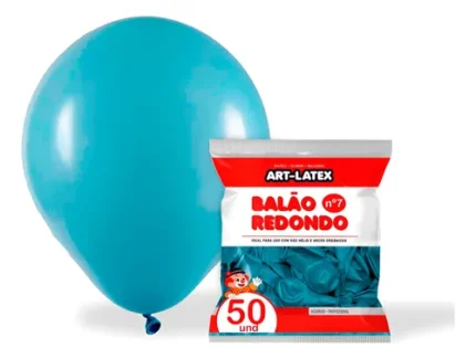 Pacote com 50 balões 7 Imperial em azul claro, feitos em látex natural, ideais para decorações de festas, aniversários e eventos variados. Balões lisos número 7 (aproximadamente 7 polegadas quando inflados) que garantem cores vibrantes e resistência. Excelente opção para decorar arcos, painéis, guirlandas, colunas e uso decorativo geral.