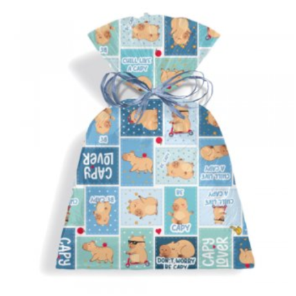 Saco para presente com estampa de capivara, tamanho 45cm x 59cm, ideal para embalar presentes pequenos e médios com praticidade, resistência e acabamento decorativo. Pacote com 50 unidades.