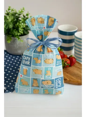 Saco para presente com estampa de capivara, tamanho 20cm x 29cm, ideal para embalar lembrancinhas e presentes pequenos com praticidade e visual decorativo. Pacote com 50 unidades.