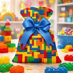 Saco para presente com estampa de blocos, tamanho 30cm x 45cm, ideal para embalar presentes pequenos com praticidade, resistência e visual infantil. Pacote com 50 unidades.