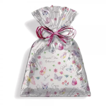 Saco para presente com estampa primavera, tamanho 45cm x 59cm, indicado para embalar presentes de médio porte com praticidade, resistência e visual decorativo. Pacote com 50 unidades.