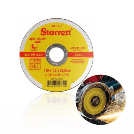 Disco de corte Starrett 4.1/2 para aço inox e metais, modelo DAC115-14. Indicado para uso em esmerilhadeiras com alto desempenho e precisão no corte.