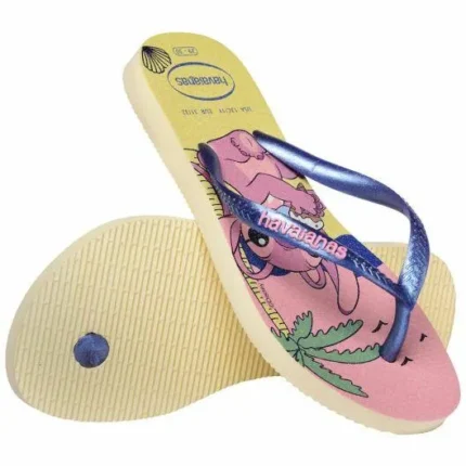 Chinelo infantil Havaianas Kids Slim Disney na cor manteiga, com design leve, confortável e ilustrado com personagens Disne