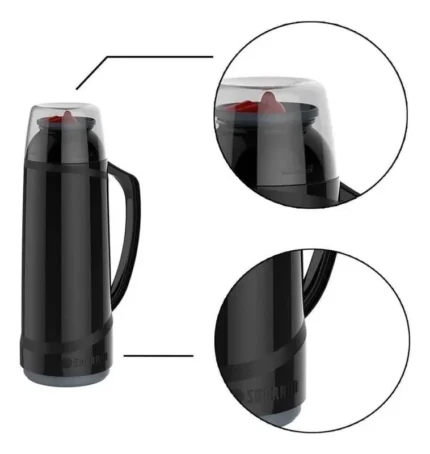 Garrafa térmica Soprano Cristal 1 litro preta com bico, ideal para conservar bebidas quentes ou frias por mais tempo.
