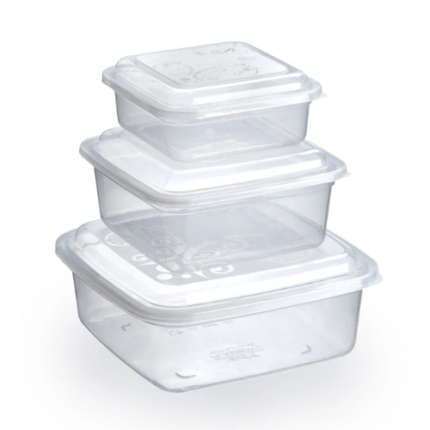 Kit com potes quadrados nos tamanhos P, M e G, ideais para armazenar alimentos com praticidade e organização.