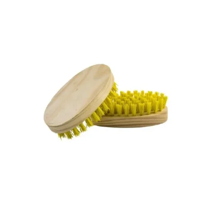 Escova oval em madeira com cerdas firmes, indicada para limpeza geral de superfícies e objetos no dia a dia.