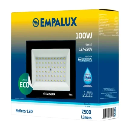 Refletor LED de 100W Empalux, luz branca 6500K, slim e econômico, ideal para áreas internas e externas.