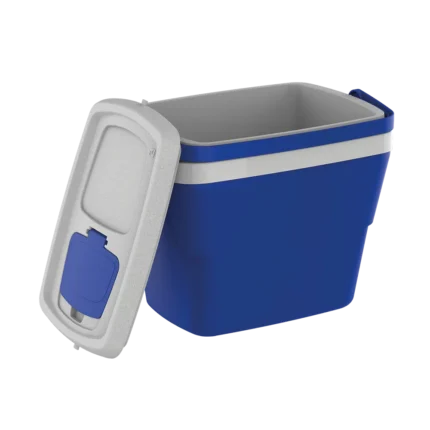 Caixa térmica 50 litros na cor azul, ideal para conservar bebidas e alimentos por longos períodos.