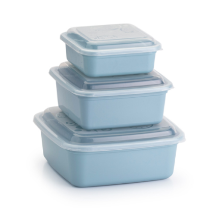 Conjunto de três potes quadrados coloridos nos tamanhos P, M e G, ideais para armazenar alimentos e organizar a cozinha.
