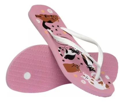 Chinelo Havaianas Slim Pets rosa chiffon, delicado, confortável e com estampa divertida.