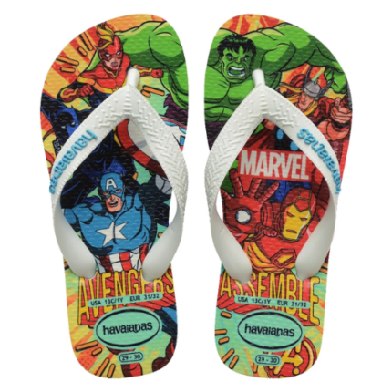 Chinelo Havaianas Kids Top Marvel II nas cores branco e azul, tamanho 35/36. Modelo infantil estampado, confortável e ideal para o dia a dia.