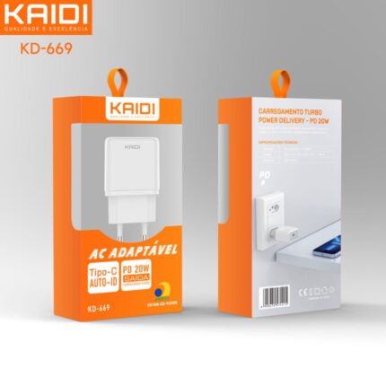 Fonte de carregamento Kaidi Tipo-C modelo KD-669 Y08-4, indicada para recarga de dispositivos compatíveis.