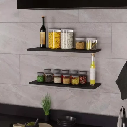 Kit com 3 prateleiras pretas de 40cm com fixação inclusa, ideal para organização e decoração de ambientes.