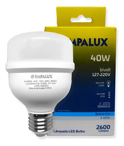 Lâmpada LED 40W com base E27, luz branca fria 6500K e alta luminosidade, ideal para ambientes amplos.