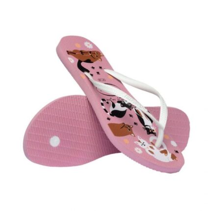 Chinelo Havaianas Slim Pets Rosa Chiffon 41/42 com estampa de cães e gatos, tiras finas, solado confortável e antiderrapante.