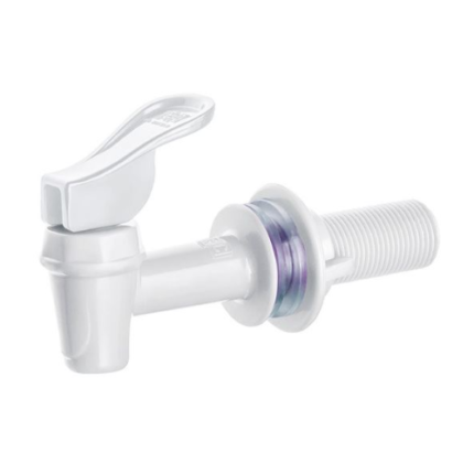 Torneira automática branca Herc com alavanca, indicada para suportes de galão de água. Ideal para controle prático da saída de água em garrafões e bebedouros.