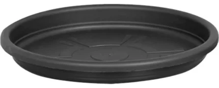 Prato de vaso redondo em plástico preto, com 35 cm de diâmetro, ideal para reter o excesso de água e proteger superfícies em ambientes internos e externos.