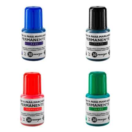 Tinta para marcador permanente VMP, ideal para reposição e uso contínuo, com escrita resistente e secagem rápida.