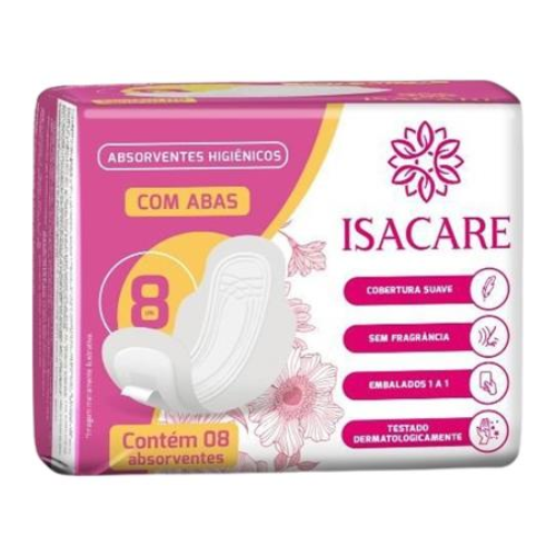Absorvente Isacare Higiênico com abas, pacote com 8 unidades, ideal para uso diário com conforto e proteção.