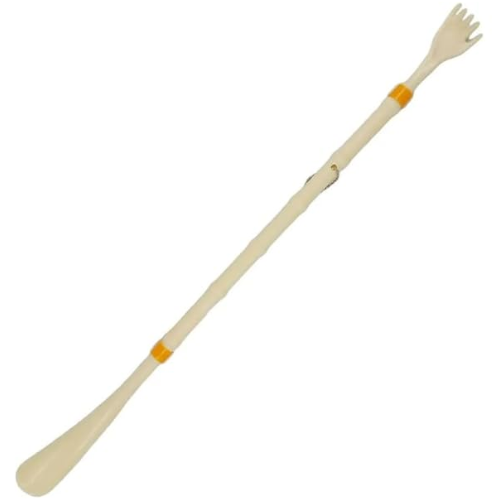 Calçador de sapatos com 49 cm de comprimento e coçador de costas integrado, ideal para facilitar o calce e proporcionar conforto no dia a dia.