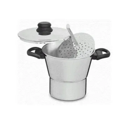 Esta cuscuzeira de alumínio tamanho 16 fabricada pela Alumínio Pato Branco é um utensílio de cozinha tradicional para preparo de cuscuz, legumes e outros alimentos cozidos a vapor. Confeccionada em alumínio resistente com alças de baquelite, garante distribuição uniforme de calor e facilidade de manuseio. Sua estrutura robusta e leve facilita o uso diário, tornando-a essencial em cozinhas residenciais ou comerciais. O utensílio possui acabamento cromado e capacidade adequada para porções médias, perfeita para famílias.
