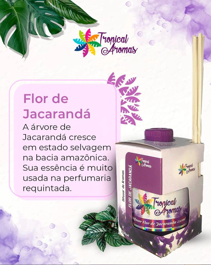 O difusor de ambiente Tropical Aromas fragrância flor de jacarandá é perfeito para quem busca um aroma sofisticado e duradouro. Sua fragrância floral suave proporciona sensação de leveza, frescor e bem-estar, tornando o ambiente mais agradável e acolhedor.