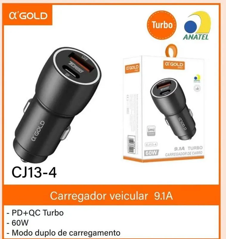 Fonte veicular 60W com saída Tipo C modelo CJ13-4, ideal para carregar celulares, tablets e outros dispositivos eletrônicos diretamente no acendedor do carro.
