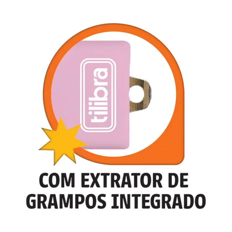 Grampeador mini com capacidade para até 10 folhas, compacto e ideal para uso diário.