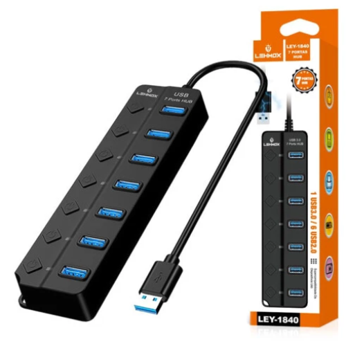 Hub USB com 7 portas modelo LEY-1840 da Lehmox, ideal para expandir a quantidade de conexões USB em computadores, notebooks e outros dispositivos eletrônicos.