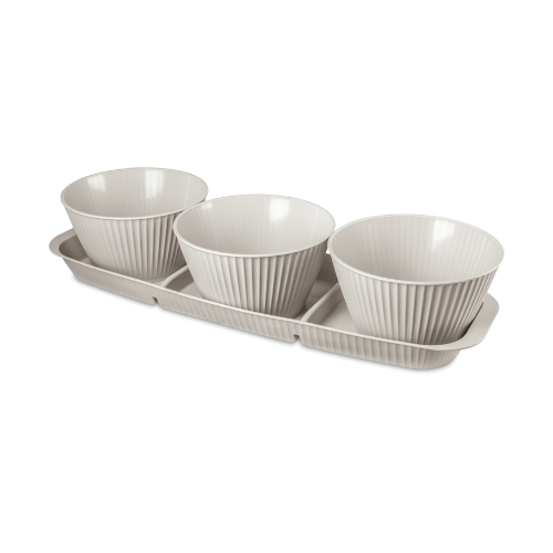 Kit petisqueira tamanho P com 3 tigelas de 0,4L, fabricado em plástico resistente na cor cinza claro. Ideal para servir petiscos, molhos e acompanhamentos com praticidade e estilo.