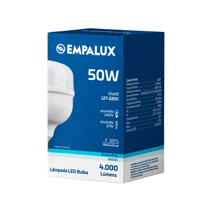 Bivolt. Base: E27. Luz branca. Fluxo luminoso: 4.000 lúmens. Temperatura da cor: 6.500K. Vida mediana: 25.000 horas. Comprimento: 15,1cm. Diâmetro: 10cm. Equivale a uma lâmpada incandescente de 270W e fluorescente de 74W. Garantia: 1 ano.
