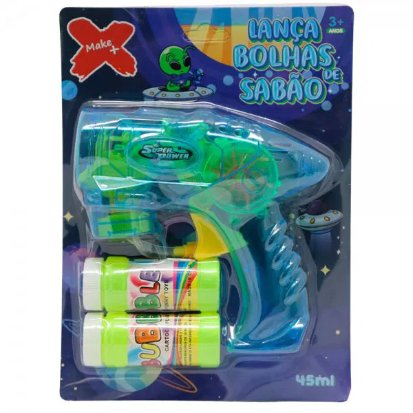 A Lança Bolha de Sabão 45ml Pistola Espacial com Luz Make+ é perfeita para divertir crianças com bolhas e efeitos luminosos.