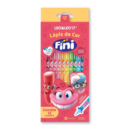 Lápis inspirado nos personagens mais doces e com formato diferenciado. Assim é o Lápis de Cor Triangular Estampado Fini – Caixa com 12 Unidades Leo&Leo. Ele é um lápis de cor de resina com 12 cores incríveis, todas relacionadas diretamente com os famosos e fofos personagens da Fini, a gigante mundial dos doces. É macio para pintar e possui formato triangular, que se adapta perfeitamente à mãozinha da criança. Sua ponta é resistente e oferece mais tempo de uso, além de ser mais fácil de apontar.