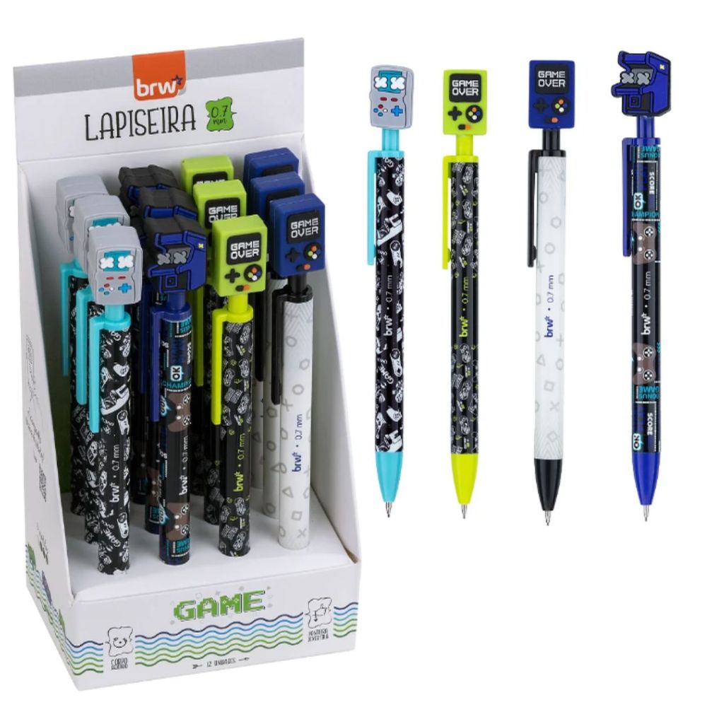 Lapiseira plástica divertida 0,7 mm modelo Game, vendida por unidade, indicada para escrita escolar e uso diário com design temático.