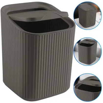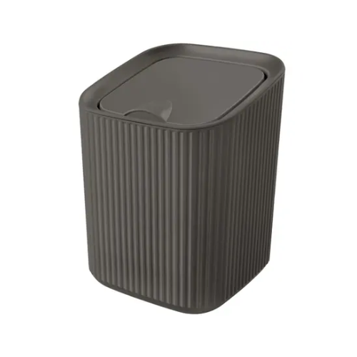 Lixeira quadrada com capacidade de 1,25 litros, cor cinza escuro, ideal para banheiros, cozinhas e escritórios. Compacta, elegante e fácil de limpar.
