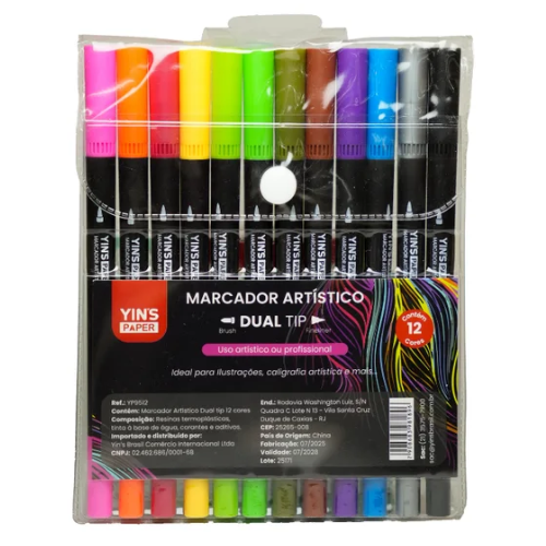 O Estojo Marcador Permanente Ponta Dupla 4/1mm C/ 12 Cores Yin é um kit completo de marcadores artísticos desenvolvido para uso criativo, escolar e profissional. Cada marcador possui duas pontas — uma ponta fina (~1 mm) para detalhes e uma ponta chanfrada (~4 mm) para preenchimentos e efeitos — permitindo versatilidade em desenhos, lettering e projetos de design. A tinta é permanente à base de água, de secagem rápida e com cores intensas, proporcionando resultados vibrantes em papel, papelão, madeira, plástico e outras superfícies.