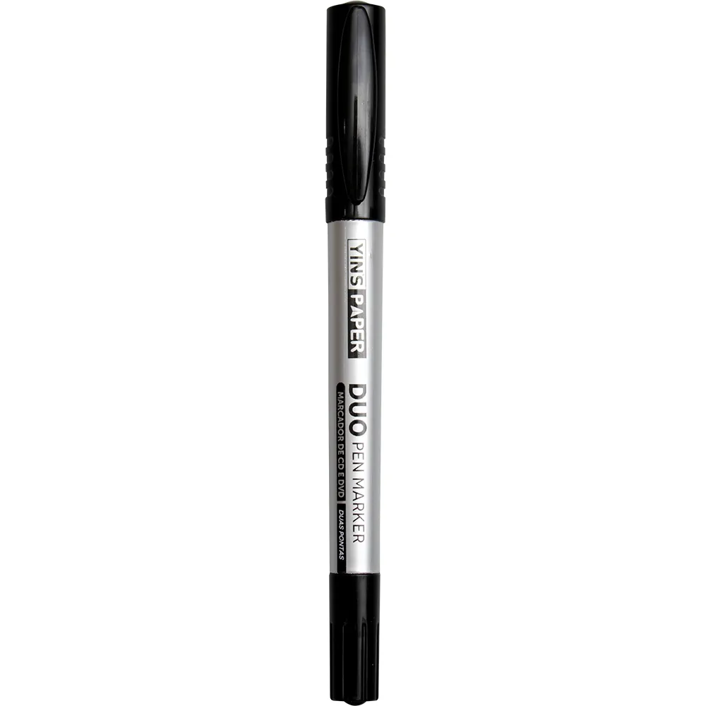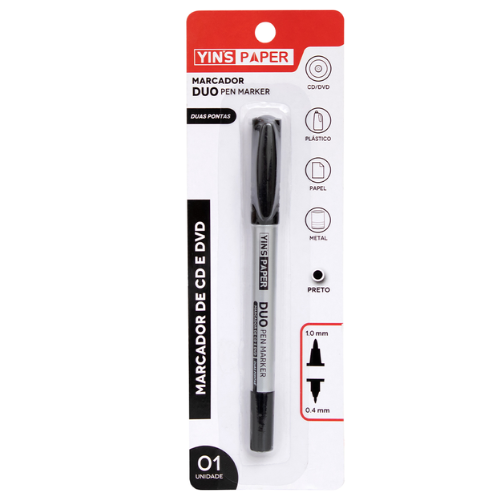 Marcador permanente duo da Yins Paper desenvolvido para oferecer praticidade e versatilidade em atividades de escrita e marcacao. Possui duas pontas em um unico produto permitindo diferentes tipos de traco para atender diversas necessidades como anotacoes identificacao organizacao e uso profissional. A tinta preta permanente apresenta boa cobertura secagem rapida e resistencia ao desbotamento garantindo marcacoes duradouras. Indicado para uso em papel plastico vidro metal madeira e outras superficies adequadas sendo amplamente utilizado em ambientes escolares comerciais industriais e domesticos.