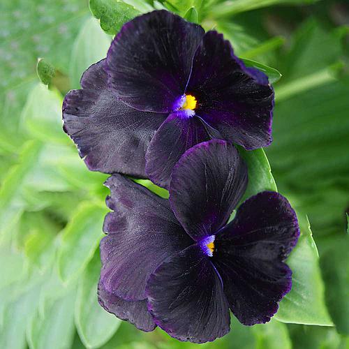 Flores grandes de coloração azul, tendem para o roxo com centro escuro.