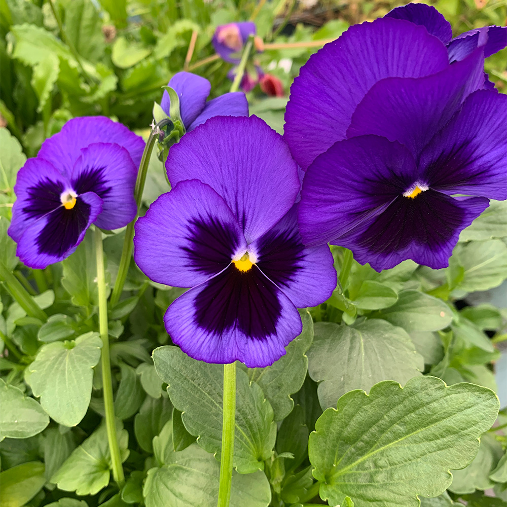 Flores grandes de coloração azul, tendem para o roxo com centro escuro.