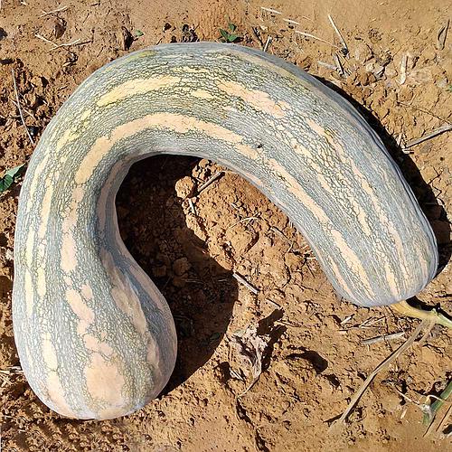 Fruto cilíndrico com pescoço de coloração verde-rajado.