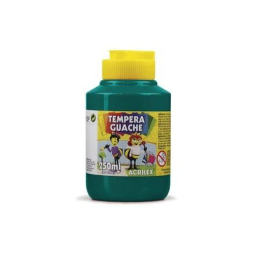 Tinta guache à base de água, de cor verde escuro intensa, em embalagem de 250 ml. Seu acabamento é opaco, possibilitando coberturas uniformes mesmo sobre superfícies claras ou previamente pintadas. A guache permite diluição para efeitos mais suaves ou aplicação direta para cobertura densa. Indicada para atividades escolares, artesanato, ilustrações ou uso profissional leve. Fácil limpeza dos pincéis e boa compatibilidade com papéis de gramatura média a alta, madeira, gesso ou cartolina. Conforme especificações de marcas similares, “a Tempera Guache é um importante instrumento para o desenvolvimento da criatividade, coordenação motora e percepção visual das cores; pode ser aplicada em papel, papel-cartão, cartolina, gesso, madeira e cerâmica”.